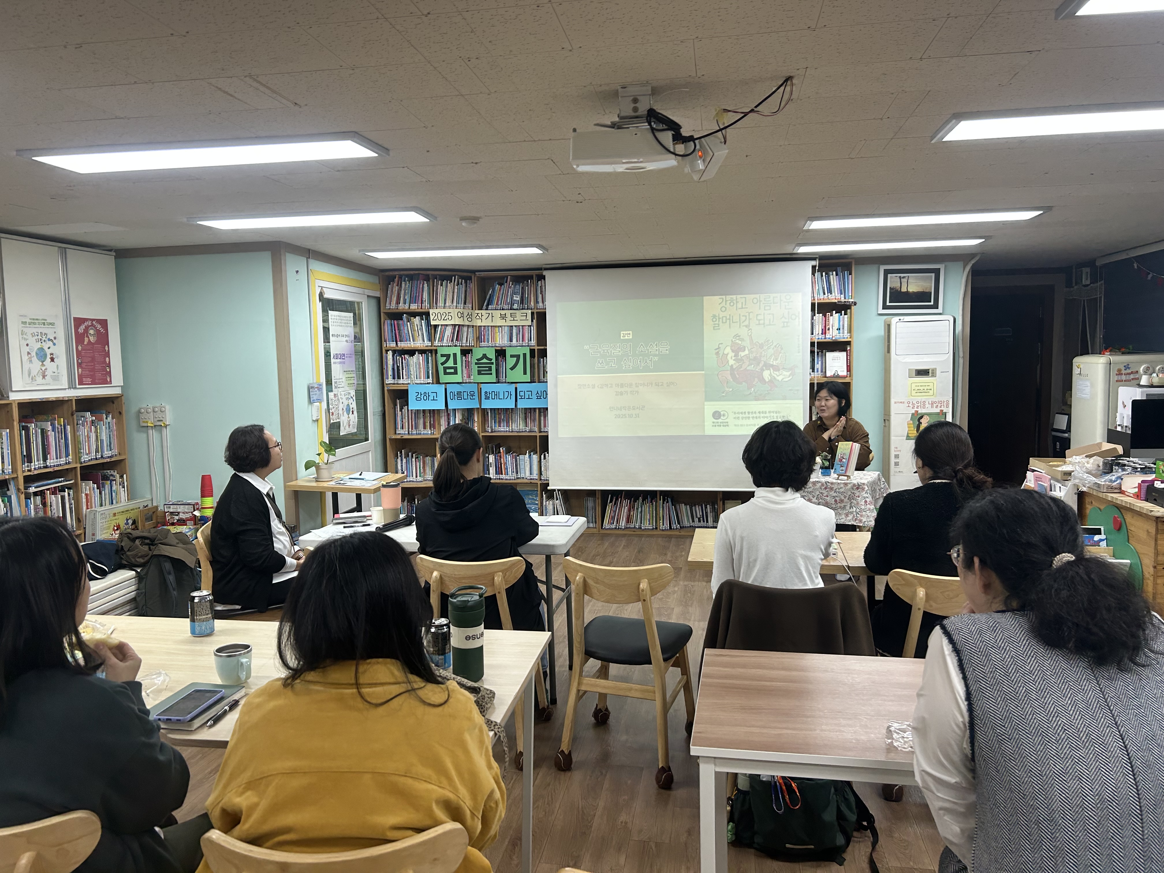 (2025.10.31.) 2025 여성작가 5인 릴레이 북토크, 김슬기 <강하고 아름다운 할머니가 되고 싶어> 영등포구의 '구절초리', 언니네작은도서관에서 '2025 여성작가 5인 릴레이 북토크'에 초대해주셨습니다.👏 <강하고-> 소설이 출간되고 여러 북토크 자리에서 감사히 얘기를 나눌 자리가 많았는데요. 제가 평소에도 너무 좋아서 끙끙 앓으며 읽었던 소설을 쓴 작가님들(예소연, 이유리, 조해진, 김멜라) 사이에 끼어 있다는 게 어찌나 영광이던지! 그래서 이번 북토크는 특히 어떤 이야기를 들려드리면 좋을지 더 고민하는 시간을 보냈답니다. 북토크에선 크게 세 주제로 나누어 이야기를 들려드렸답니다. 1. 평범한 회사원이, 소설 쓰기의 매력에 빠지게 된 과정2. 소설 <강하고 아름다운 할머니가 되고 싶어>의 숨은 이야기들3. 소설 창작 꿀팁 물론 소설 <강하고 아름다운 할머니가 되고 싶어>의 숨겨진 의미나 이리 쿵 저리 쿵 부딪히며 창작했던 과정을 들려드리는 일도 재미있어요. 그런데 결국 제가 제일 힘주어서 하게 되는 말은 이거더라고요. "여러분도 소설 쓰세요. 진짜 재밌어요. 아직 못 느끼겠다고요? 그럼 이 매력을 또 한 번 보시면..." '언니네작은책방' 자리에 함께 해주신 독자님들 중에도 '나도 소설 한 번 써볼까?' 하고 설렘을 느낀 분이 한 분이라도 생긴다면 제 목적은 달성한 셈이지요. 호호. 늦은 밤까지, 지친 기색 하나 없이 눈을 반짝이며 경청해주셨어요.'다음 이야기'를 기다린다는 말을 전해주셨을 땐, 실은 속으로 울컥하기도 했고요. 더 열심히 써야겠다, 다음 이야기를 들고 찾아와야겠다 마음을 다지는 시간이었어요. 강연을 마치고 돌아가는 길! 영등포구에도 언제든 비를 피할 수 있는 따뜻한 아지트가 생겼구나. 그런 든든한 기분을 느끼며 걸음을 옮겼습니다. 다음에 또 만나요! 👋